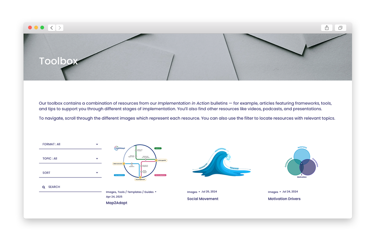 Together, we can design and build custom implementation tools that are interactive, user-centered, and evidence-informed—transforming your ideas into intuitive tools people can easily use and put into action.