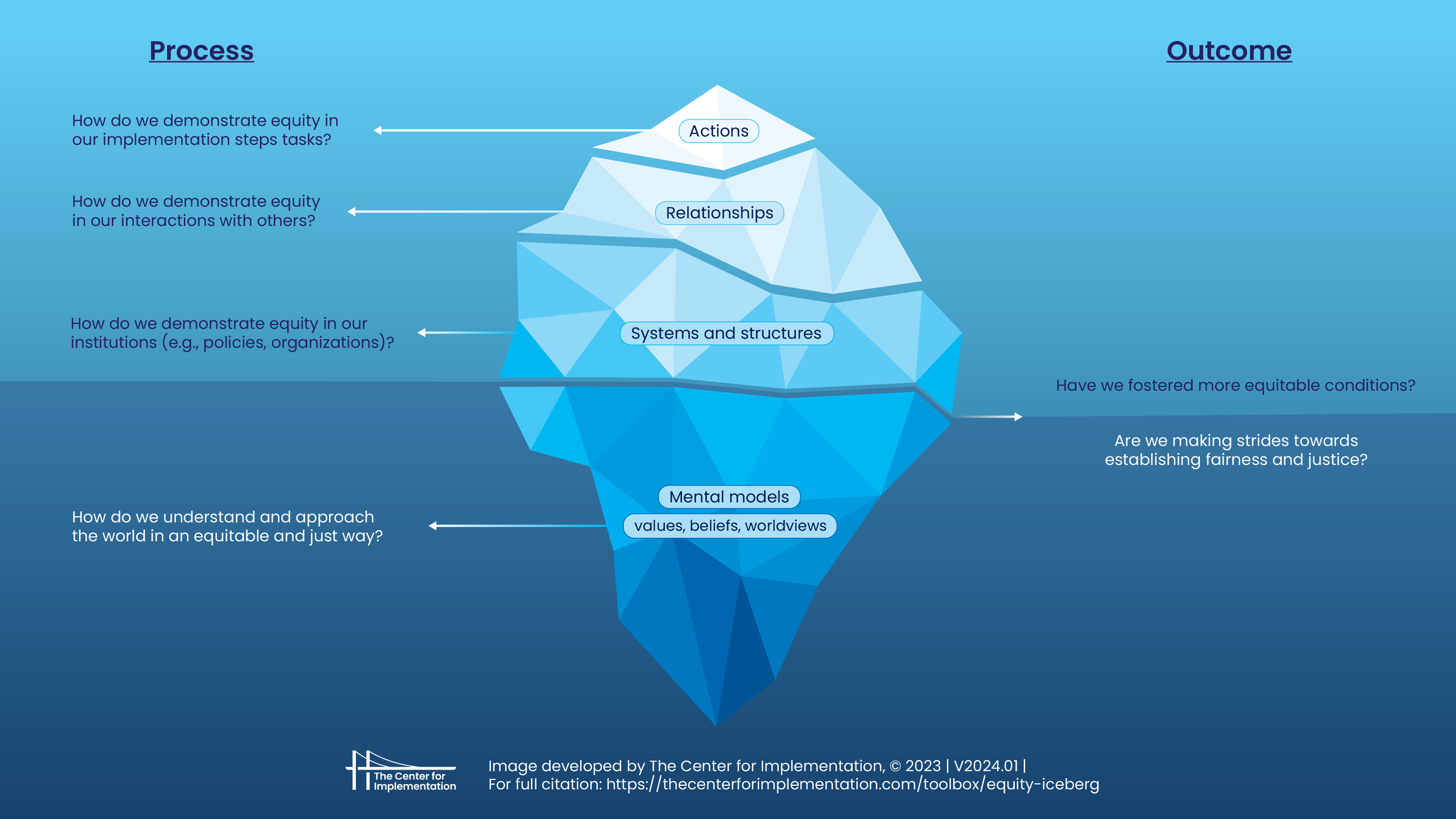 Khan, S., & Moore, J. E. (2023). Embedding equity into implementation: The equity iceberg. Implementation in Action Bulletin. Retrieved from https://thecenterforimplementation.com/toolbox/embedding-equity