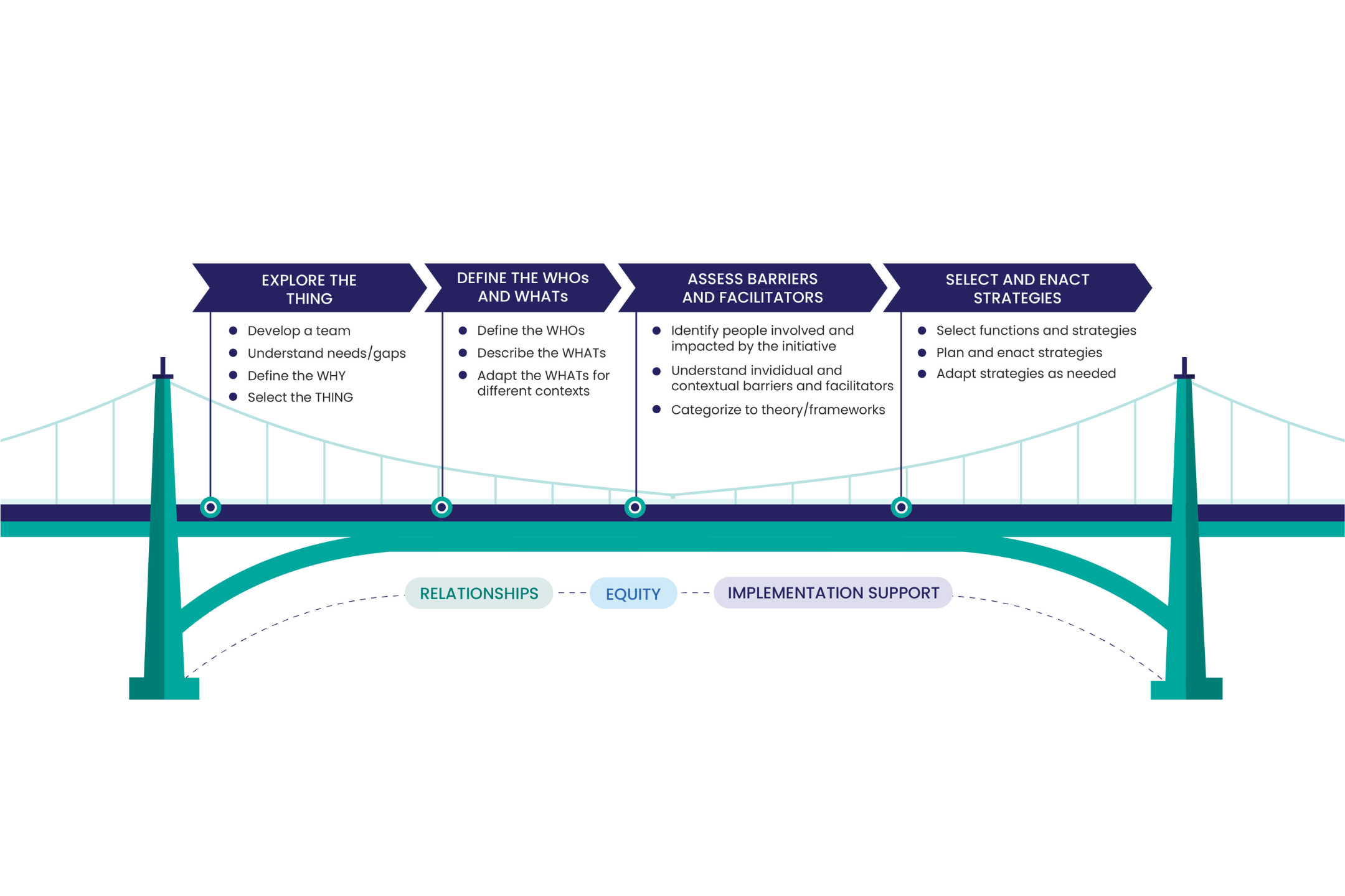 The StrategEase Pathway is a process model that guides people through the stages of designing change initiatives. The bridge rests on a foundation of strong relationships. On the top of the bridge are a series of activities that can help you to understand the THING being implemented, define WHAT needs to change and WHO needs to do something differently, assess barriers and facilitators, and finally select change strategies.